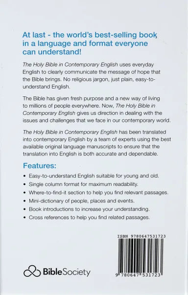The Holy Bible in Contemporary English uses everyday English to clearly communicate the message of hope that the Bible brings. No religious jargon, just plain, easy-to-understand English. It has been translated by a team of experts using the best available original language manuscripts to ensure that the translation into English is both accurate and dependable.