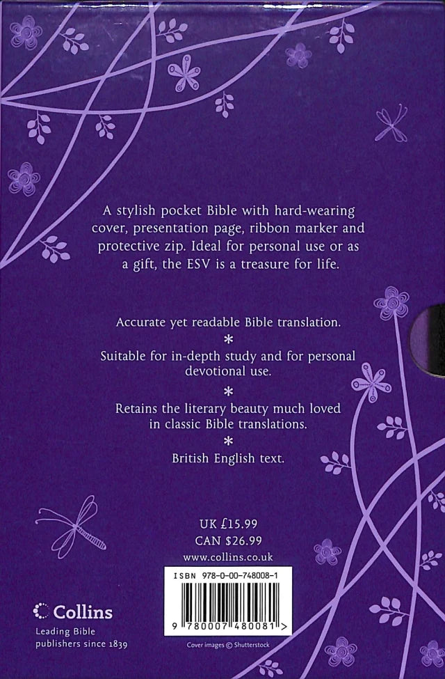 An attractive, compact edition of the English Standard Version of the Bible; the world's fastest-growing Bible translation. Ideal as a gift or for personal use. This purple edition features a protective zipper, and combines a readable font size with portability - perfect for reading on the move. Its many helpful features include: * British English Text * Compact, portable size * Double-column format with black letter text * Concordance * Protective zipper * Presentation page * Ribbon marker * Gilt page edges The English Standard Version is a great choice for personal reading and study, for private devotions and family prayers, and for teaching, preaching, and worship. An 'essentially literal' translation, the ESV Bible combines word-for-word accuracy with readability, literary excellence, and depth of meaning. More than 100 of the world's leading Bible scholars and teachers were involved in creating the ESV Bible. Trusted worldwide, the ESV is a treasure for life.