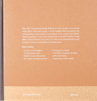 The ESV Journaling Study Bible pairs the content of a robust study Bible with extra-large, 2-inch margins that are perfect for writing observations, prayers, and more as you study God's Word. Featuring more than 12,000 study notes adapted from the ESV Student Study Bible, this journaling Bible also includes nearly 900 special facts, 120 Bible character profiles, 10 topical articles, a glossary of key terms, more than 80 maps and illustrations, and 80,000 cross-references. These and many other features make it the most comprehensive and content-rich journaling Bible available today.