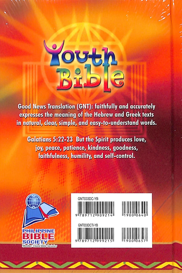 This is Youth edition Good News Bible with the Deuterocanonicals. The Good News Youth Bible is the Bible designed for the Catholic youth. With a colourful hardbound cover, and a Good News Translation (GNT), young people will surely appreciate and understand the Bible. Presentation page; Book introductions; Double-column format; Footnotes; Word list; Passages from the Septuagint; Chronology of the Bible; Subject index; 14 maps; Information on the Basic Ecclesial Communities in the Philippines; Finding help in the Bible; Readings for special days and events; Yearly Bible reading plan.