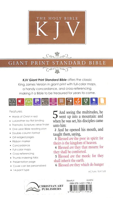 With an easy to read 14-point type in a double-column format and footnote cross-reference guide, concordance and topical verse finder, you'll find this Giant Print Edition of the King James Bible a great resource for study and reading without eye strain. The words of Christ are printed in red ink, and there are 8 full-color annotated biblical maps. This KJV edition includes the Epistle Dedicatory. A presentation page is included to give this Bible as a gift on a special occasion. A coordinating satin ribbon marker holds your place, while the thumb index makes it easy to find your place.