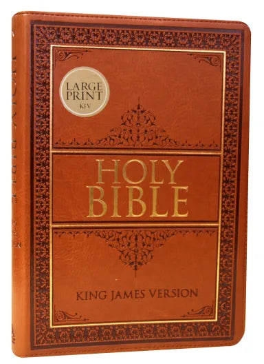 Stunning Tan Faux Leather Bound Large Print Edition King James Bible. The cover is constructed of quality man-made material imported from Italy, with the look and feel of real leather (trade name LuxLeather). Design features include an engraved filigree cover design on the front and back, gold foiled debossed title and accents, gold gilt-edged pages with thumb indexing and an attached ribbon page marker.