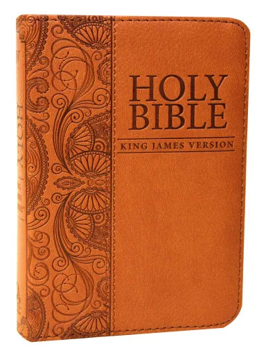 :Our Beautiful Tan Mini Pocket Edition King James Version Bible will disarm you with its intricate detail. The cover is constructed of quality man-made material imported from Italy, with the look and feel of real leather (trade name LuxLeather).