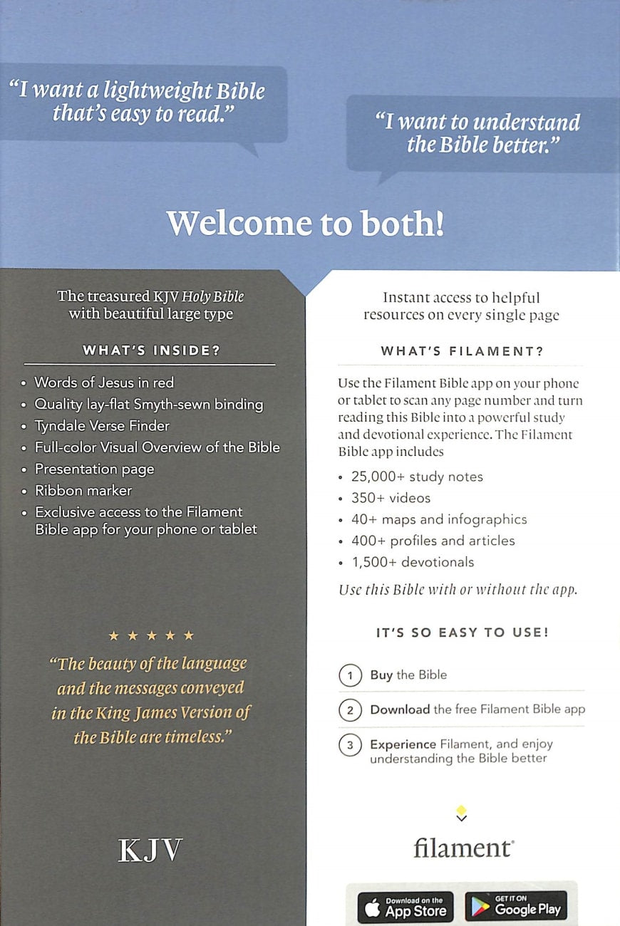 The new Tyndale KJV Personal Size Giant Print Bible, Filament-Enabled Edition has readable text and an attractive layout in an easy-to-carry size. And while it has the same low price as basic text-only Bibles, the KJV Personal Size Giant Print Bible offers much more. It not only features a bold new design and the trusted and revered King James Version (KJV) but also includes the groundbreaking Filament Bible app. This app enables you to use your mobile phone or tablet to connect every page to a vast array of related content, including study notes, devotionals, interactive maps, informative videos, and worship music.