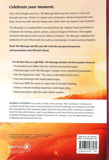 Celebrate your moment. Life is full of highs and lows. The Message Bible has the words to carry you through each one. Words of comfort and celebration. Words of heartache and hope. Enjoy the gifts that life brings and a Bible that can express each moment.