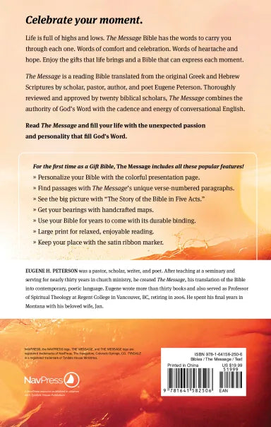 :Celebrate your moment. Life is full of highs and lows. The Message Bible has the words to carry you through each one. Words of comfort and celebration. Words of heartache and hope. Enjoy the gifts that life brings and a Bible that can express each moment.