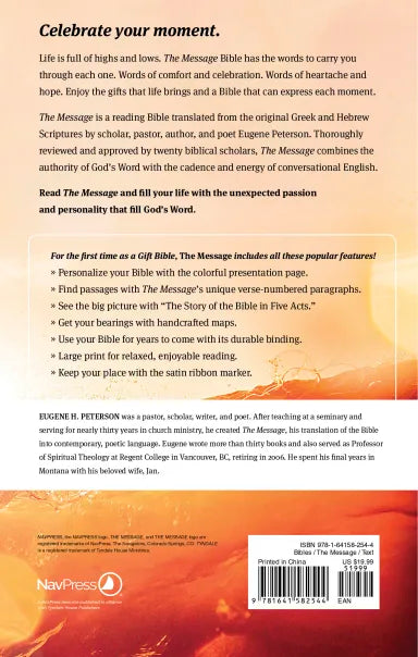 Celebrate your moment. Life is full of highs and lows. The Message Bible has the words to carry you through each one. Words of comfort and celebration. Words of heartache and hope. Enjoy the gifts that life brings and a Bible that can express each moment.