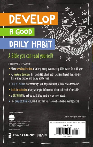 :Complete with a year's worth of devotions, the Kids' Devotional Bible, NIrV will help children develop a habit they'll want to keep. Engaging weekday devotions, fun weekend activities, interesting illustrations, and a dictionary make this a Bible they'll want to read and apply to their lives. It includes the complete New International Reader's Version (NIrV)-the stepping stone to the NIV-making it easier for young readers to read and understand.