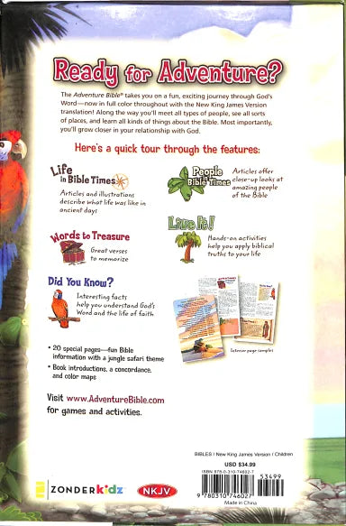 :Ready for adventure? Embark on a fun, exciting journey through God's Word with the full-color NKJV Adventure Bible. Along the way you'll meet all types of people, see all sorts of places, and learn all kinds of things about the Bible. Features include: 'Life in Bible Times - Articles and illustrations describe what life was like in ancient days; 'People in Bible Times' - Offers close-up looks at amazing people of the Bible; 'Did You Know?' - Provides interesting facts that help you better understand God's Word; 'Let's Live It!' - Includes hands-on activities to help you apply biblical truths to your life; 'Words to Treasure' - Highlights great verses to memorize; a concordance for help in finding verses; book introductions for basic facts about each book of the Bible (who wrote it, where it took place, and why it was written); 20 special pages with Bible facts and fun, all with a jungle safari theme; and 8 pages of color maps.