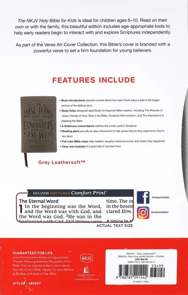 Kids will be proud to carry this easy-to-read edition of the timeless New King James Version. The NKJV Bible for Kids is ideal for children ages 6-10 to read on their own or with the family. Age-appropriate tools are included to help early readers begin to interact with and explore the Scriptures independently. As part of the Verse Art Cover Collection, this edition's cover is branded with an inspiring verse ideal for committing to memory.
