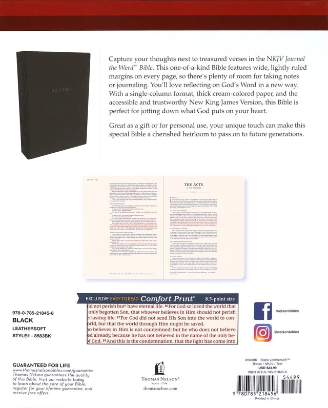 The NKJV Journal the Word™ Bible is truly inspirational from cover to cover and sure to make an excellent gift as a treasured personal keepsake. The Thomas Nelson NKJV Comfort Print® typeface is designed to honor the beauty of the New King James Version, providing a particularly smooth reading experience for longer engagement in God's Word.