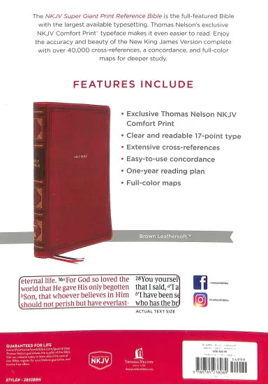 :Enjoy God's Word in the trustworthy New King James Version in the largest print size available. With the NKJV Super Giant Print Reference Bible, you won't have to sacrifice study features for readability. A complete cross-reference system, a concordance, and full-color maps make this the go-to Bible you'll look forward to reading.