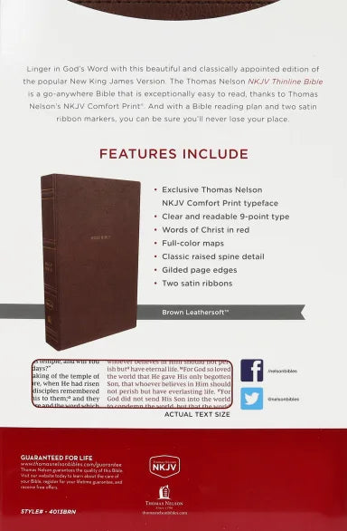 :This lightweight and portable Thinline Bible is beautiful inside and out. It features classic details on the spine, the ultimately readable NKJV Comfort Print® with the words of Christ in deep red, a reading plan, and full-color maps.