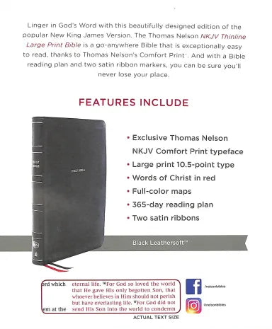 :The slim design of the NKJV Large Print Thinline means you can bring it along, wherever your day takes you. This large print edition features Thomas Nelson's NKJV Comfort Print®, designed to provide a smooth reading experience of the accurate and beautiful New King James Version and deeper engagement in God's Word. The deluxe features on this Bible include classic raised rib details on the spine, a premium faux leather cover, and two wide satin ribbons.