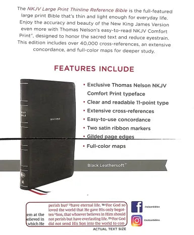 :The slim design of the NKJV Large Print Thinline Reference Bible means you can bring it along, wherever your day takes you. This large print edition features Thomas Nelson's NKJV Comfort Print®, designed to provide a smooth reading experience of the accurate and beautiful New King James Version. And with features like a complete reference system, book introductions, a concordance, and full-color maps, you'll still have the tools to get more out of God's Word.