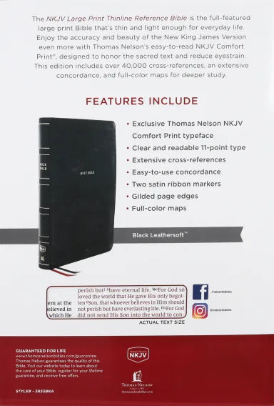 :The slim design of the NKJV Large Print Thinline Reference Bible means you can bring it along, wherever your day takes you. This large print edition features Thomas Nelson's NKJV Comfort Print®, designed to provide a smooth reading experience of the accurate and beautiful New King James Version. And with features like a complete reference system, book introductions, a concordance, and full-color maps, you'll still have the tools to get more out of God's Word.