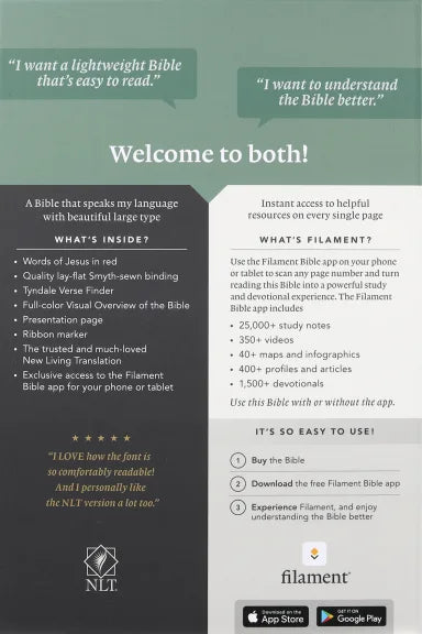 The new Tyndale NLT Personal Size Giant Print Bible, Filament-Enabled Edition has readable text and an attractive layout in an easy-to-carry size. And while it has the same low price as basic text-only Bibles, the NLT Personal Size Giant Print Bible offers much more. It not only features a bold new design and the trusted and much-loved New Living Translation (NLT) but also includes the groundbreaking Filament Bible app. This app enables you to use your mobile phone or tablet to connect every page to a vast array of related content, including study notes, devotionals, interactive maps, informative videos, and worship music.