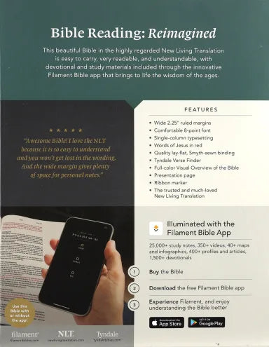 :NLT Wide Margin Bible, Filament-Enabled Edition is the only journaling Bible with access to the Filament Bible app, which features thousands of study notes, devotionals, videos, reading plans, and more! This single-column, wide-margin New Living Translation Bible has 2.25" lightly ruled margins, making this Bible great for note-taking, journaling, recording prayers, doodling, drawing, or any other creative expression in response to God's Word. Special features include quality white Bible paper for journaling; a beautiful line-over-line setting with an attractive font; a durable Smyth-sewn, lay-flat binding; a matching ribbon marker; and elegant spine hubs.