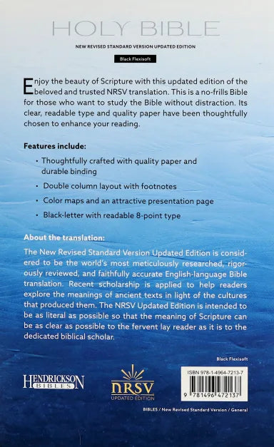 :The growth of information makes for an ever-changing world. However, the importance of Scripture remains unchanged. To ensure the enduring value of inspired sacred texts, Friendship Press, together with the National Council of Churches and in partnership with the Society of Biblical Literature, has undertaken the careful task of updating the NRSV Edition of the Bible. We are pleased to present you with what we can in full confidence call the world's most meticulously researched, rigorously reviewed, and faithfully accurate English-language Bible translation. You will find that this new NRSV edition is the most extensively updated English-language Bible translation available on the worldwide market to date. Recent scholarship is applied to ancient texts to help readers explore the meanings of ancient texts in light of the cultures that produced them. The NRSV Updated Edition is intended to be as literal as possible so that the meaning of scripture can be as clear as possible to the fervent lay reader as it is to the dedicated biblical scholar. As stewards of the NRSV Updated Edition, we invite you to join the journey of exploration with all the passionate attention and consideration that sacred Scriptures richly deserve.