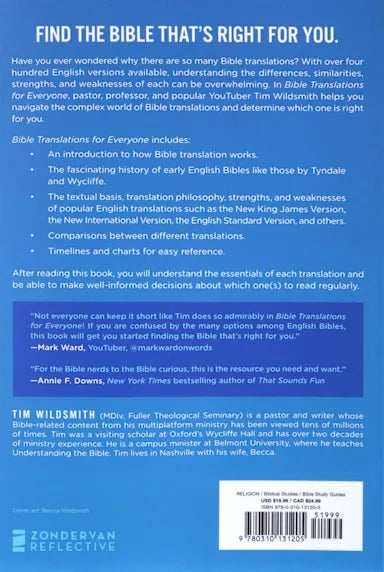 Bible Translations for Everyone is a fun and engaging guide in which pastor, professor, and popular YouTuber Tim Wildsmith will help you navigate the complex world of Bible translations.