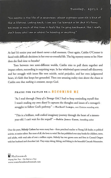 It's challenging enough to be a normal high school senior -- but Caitlin O'Conner has a host of new difficulties to deal with in the third book of Melody Carlson's widely popular and fascinating teen series. Time is critical to help the orphans in Mexico, missions-minded Caitlin believes, but Mom and Dad are set on her attending college. Meanwhile, her relationship with Josh takes on a serious tone via e-mail -- threatening her commitment to "kiss dating goodbye." When Beanie begins dating an African-American, Caitlin's concern over dating seems to be misread as racism. One thing is obvious: God is at work through this dynamic girl in very real but puzzling ways. A soul-stretching time of racial reconciliation at school and within her church helps her discover God's will as never before.