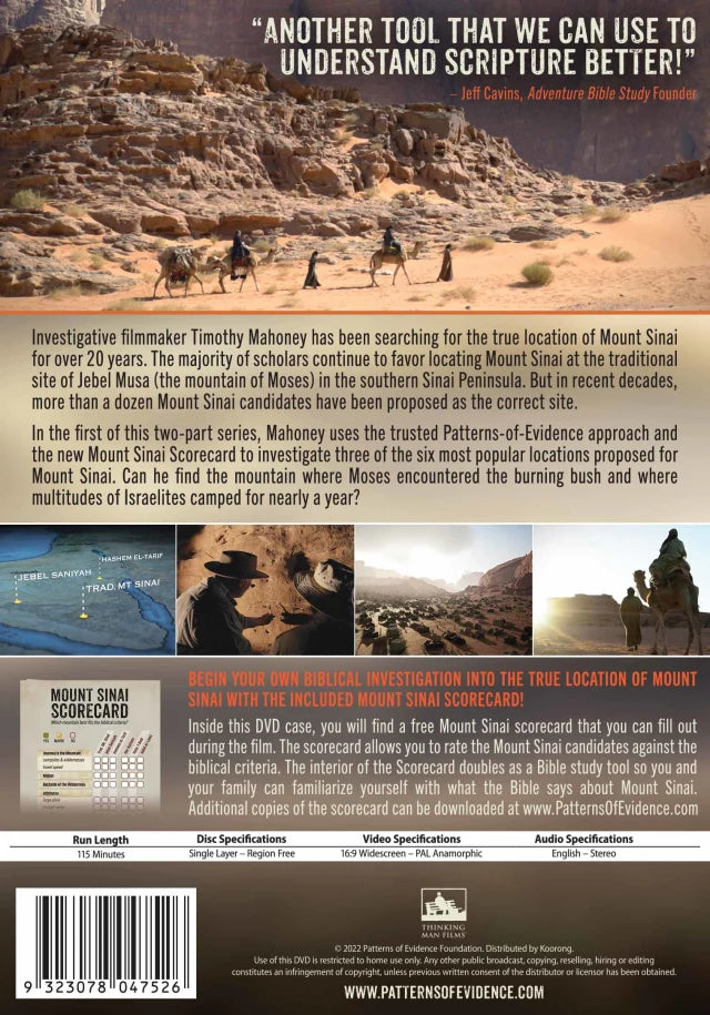 Mahoney uses the trusted Patterns-of-Evidence approach and the new Mount Sinai Scorecard to investigate six of the most popular locations proposed for Mount Sinai. Examining details for five major criteria in the biblical account compared to geographical and archaeological information, he sets out to pin-point the mountain’s true location. Journey to Mount Sinai is a 2-part film series that picks up the exploration of the Exodus where the Red Sea Miracle films left off. Each film will examine three of the primary candidates.