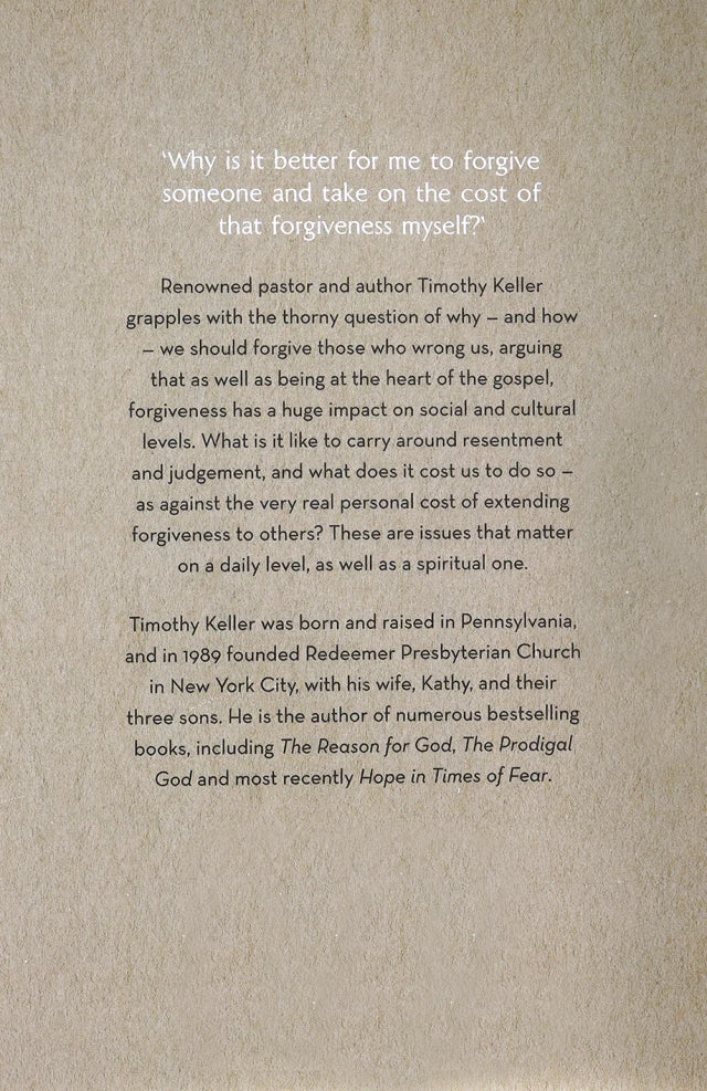 'Why is it better for me to forgive someone and take on the cost of that forgiveness myself?' In his new book, renowned pastor and author Timothy Keller grapples with this thorny question: why we should forgive those who hurt us. It is the heart of the gospel, but it's not solely important on a religious level; the matter of forgiveness has a huge impact on social and cultural levels, in terms of how we deal with the people, and problems, in our lives. What is it like to carry around resentment and judgement, and what does it cost us to do so- as against the very real personal cost of extending forgiveness to others? These are issues that matter on a daily level, as well as a spiritual one. Writing with his trademark wisdom and deep reliance on the Bible, Keller helps readers think about these questions in an way that will help them rethink their lives, in ways that point to Jesus showing us how to live in the world- and how we can live in a spirit of forgiveness.