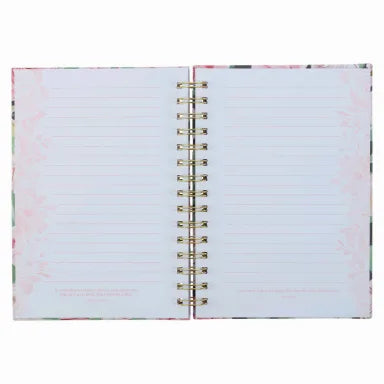 The front and back covers are bound by gold-toned wire. Each page is lined and features a Scripture. The front of the wirebound journal holds a presentation page that can be personalized or inscribed with a heartfelt message when it is given as a gift.