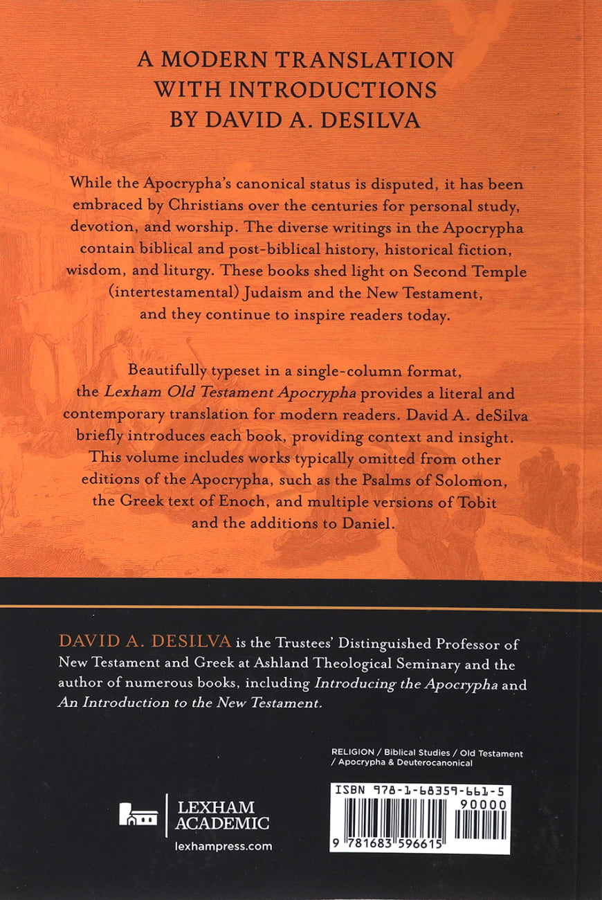 A modern translation with introductions by David A. deSilva. The Lexham Old Testament Apocrypha includes: Tobit (Vaticanus and Sinaiticus) Judith Greek Esther (Greek) Wisdom of Solomon Wisdom of Sirach Baruch Letter of Jeremiah the additions to Daniel (Old Greek and Theodotion), including the Prayer of Azariah, Susanna, and Bel and the Dragon 1-4 Maccabees 1-2 Esdras the Prayer of Manasseh Psalm 151 Psalms of Solomon Greek 1 Enoch Beautifully typeset in a single-column format, the Lexham Old Testament Apocrypha provides a literal and contemporary translation for modern readers. David A. deSilva briefly introduces each book, providing context and insight. This volume includes works typically omitted from other editions of the Apocrypha, such as the Psalms of Solomon, the Greek text of Enoch, and multiple versions of Tobit and the additions to Daniel. The Apocrypha has been highly esteemed throughout history. While its canonical status is disputed, it has been embraced by Christians over centuries for personal study, devotion, and worship. The diverse writings in the Apocrypha contain biblical and post-biblical history, historical fiction, wisdom, and liturgy. These books shed light on Second Temple (intertestamental) Judaism and the New Testament, and they continue to inspire readers today.
