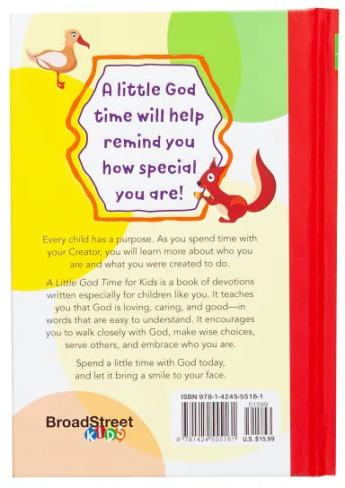 A Little God Time for Kids is a book of devotions for children aged 4-7. It teaches them that God is loving, caring, and good in words that are easy-to-understand.
