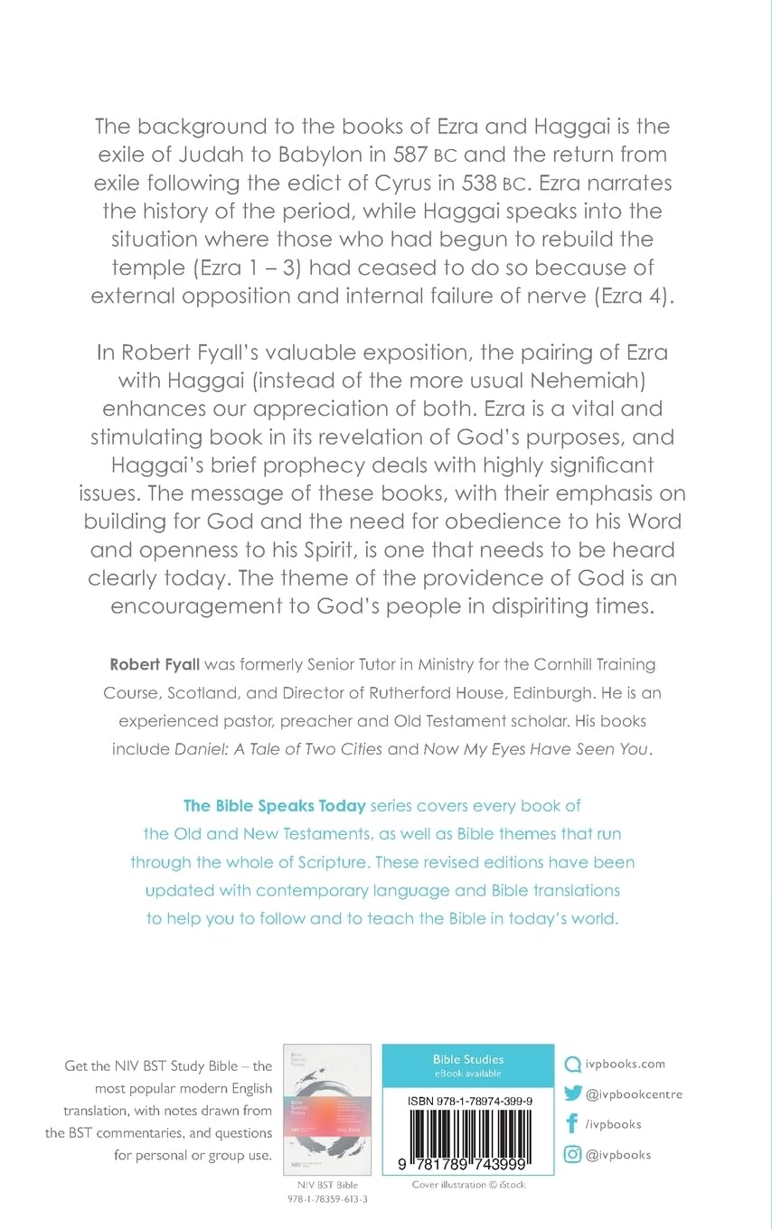 Ezra is rarely if ever preached on. Haggai gets even shorter if anything, Haggai 1 is pressed into service to encourage a reluctant congregation to give to an ailing fabric fund.But the message of these books, and their emphasis on building for God and the need of obedience to his Word and openness to his Spirit, is one which needs to be heard clearly today. This commentary by Robert Fyall highlights the contemporary parallels of the challenges Israel faced to those of today's church and demonstrates the relevance of the books of Ezra and Haggai for God's people in all times. With passage-by-passage exposition of the biblical text, this resource will be helpful for pastors, teachers and anyone who wants to dive deeper into these seldom discussed Old Testament books.