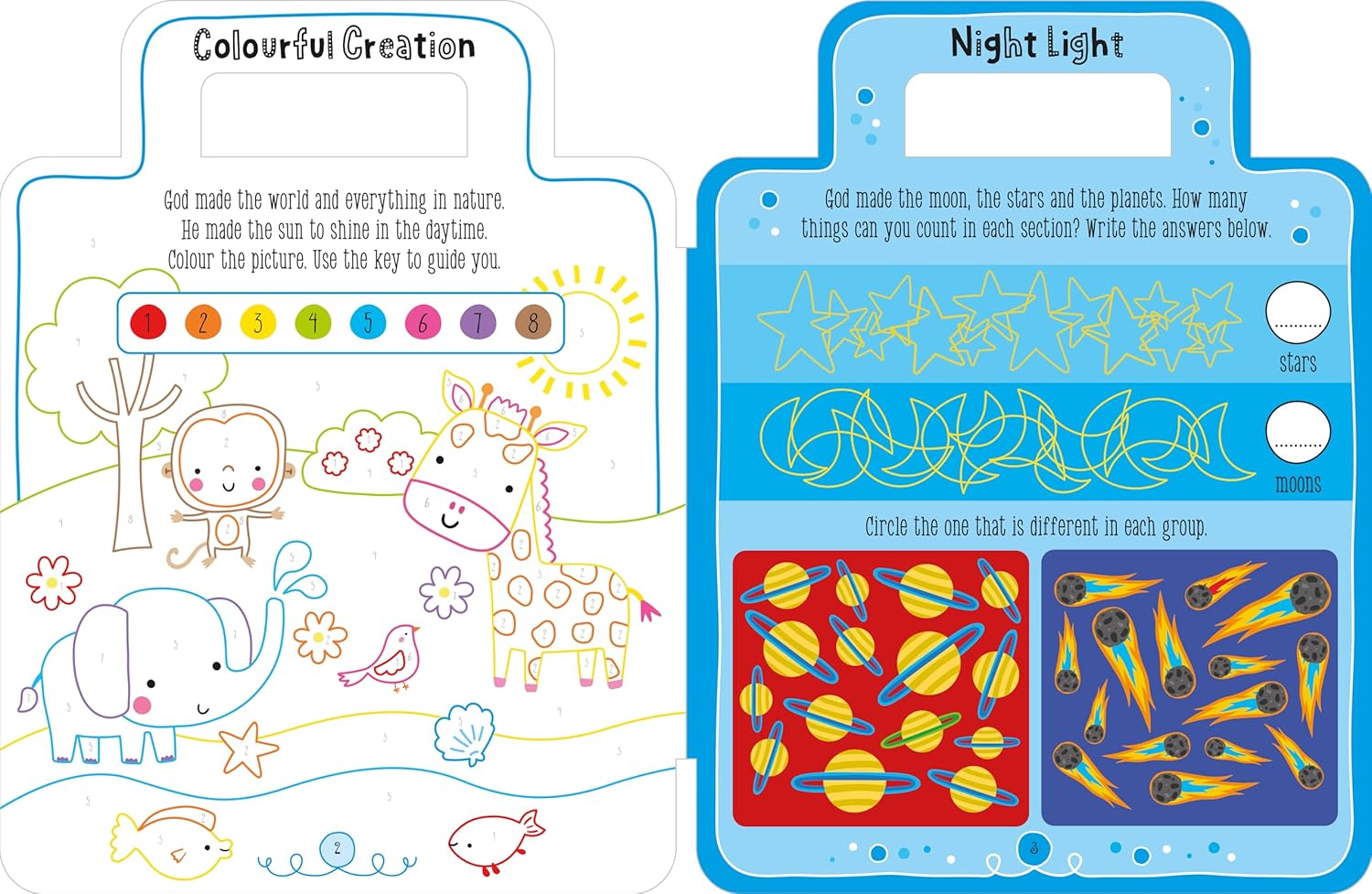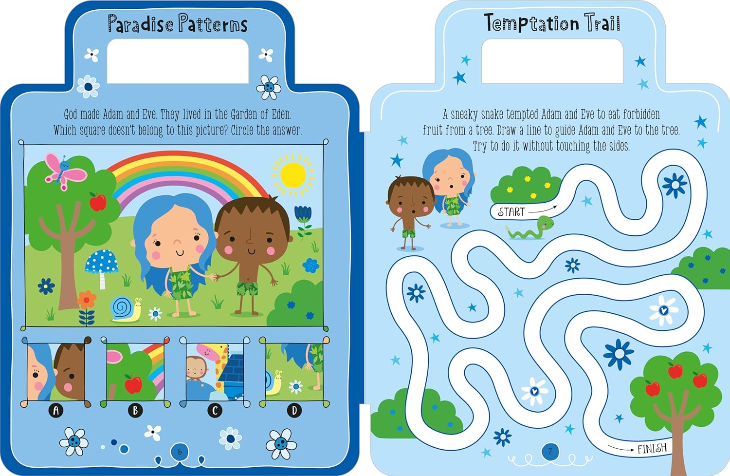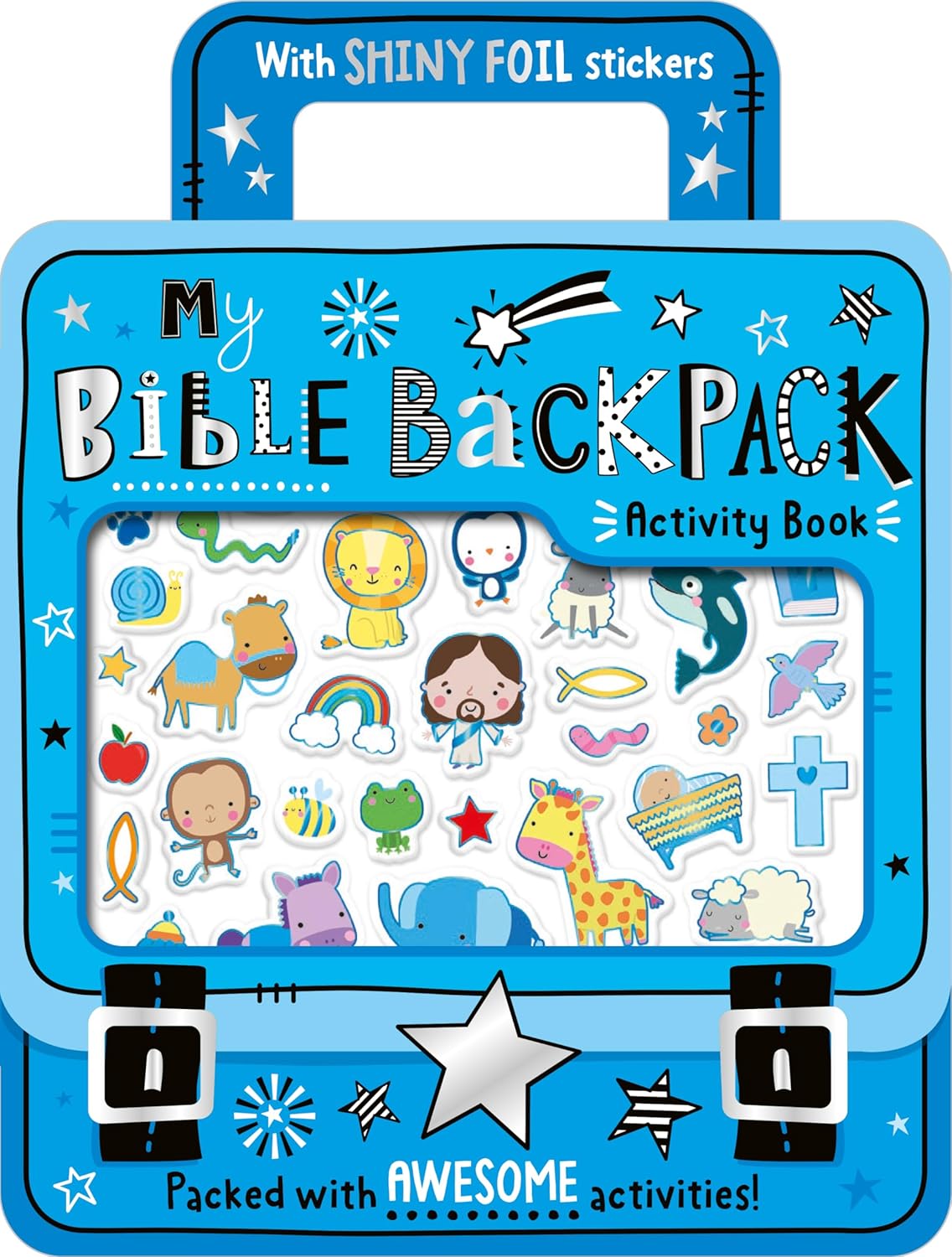 Discover inspirational Bible stories and learn about God's world in the awesome My Bible Backpack Activity Book! Children will love solving puzzles and completing activities inspired by beloved Bible stories, from colouring God's amazing creatures to solving puzzles with Jesus. This delightful activity book features amazing card crafts to create and shiny foil stickers to use in the book or wherever you want. Plus, the book's carry-handle is perfect for on-the-go fun! My Bible Backpack Activity Book: * Will introduce children aged 4-7 to key Bible stories in an interactive way that will keep their interest * Provides hours of fun with Bible-themed crafts, activities, puzzles and stickers * Has a useful handle so kids can carry it wherever they go * Makes a lovely gift idea for young boys Packed with awesome activities, My Bible Backpack Activity Book will keep young kids aged 4 to 7 entertained for hours as they discover some of the best-loved Bible stories.