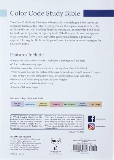Additionally, you will find helpful notes throughout the Scripture leading you to study the Bible book by book, verse by verse, or topic by topic. Whether you choose one approach or all three, the Color Code Study Bible gives you dynamic, practical approach for regular Bible reading—and even includes generous margins for your own notes.