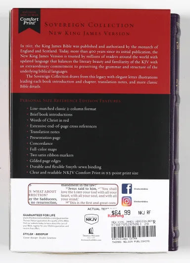 :The New King James Version in the Sovereign Collection reflects the legacy and majesty of the King James Version Bible produced more than 400 years ago, but in language updated for today. This beautiful Bible, which contains design flourishes that pay tribute to the Bible produced in 1611, comes in a convenient portable size with essential study tools and traditional red-letter text for the Words of Christ.