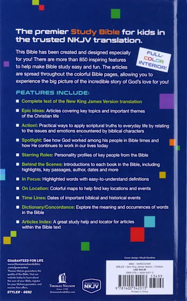 The NKJV Study Bible for Kids helps children enjoy reading and understanding God’s Word. Over 850 study notes explain scripture in a simple way for a child to grasp in an engaging full-color design. These time-tested discipleship notes lay a solid foundation for lifelong spiritual growth that kids can begin to experience for themselves.