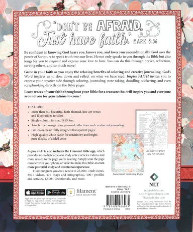 The bestselling Inspire Bible is a beautiful single-column, wide-margin New Living Translation Bible for coloring and creative journaling. The all-new Inspire FAITH Bible, Filament-Enabled Edition, has even more beautiful line-art to color, with over 400 faith-themed Scripture illustrations attractively displayed throughout the Bible. Lightly ruled, three-inch-wide margins offer additional space to write notes and reflections or to draw and create. Inspire's 8.65-point font is larger and more readable than most full-size journaling Bibles, and the high-quality Bible paper makes it the perfect choice for creatively responding to God's Word right on the pages of the Bible. In addition to being a creative journaling Bible, the Filament Bible app turns Inspire FAITH into a powerful study and devotional tool, offering more to expand your mind and touch your heart than you can possibly hold in your hand. This groundbreaking app enables you to use your mobile phone or tablet to connect every page to a vast array of related content, including study notes, devotionals, interactive maps, informative videos, and worship music. Of course, you can use Inspire FAITH without the app, but when you want to dig deeper, grab your phone or tablet and explore God's Word with the Filament Bible app. It's so easy to use.