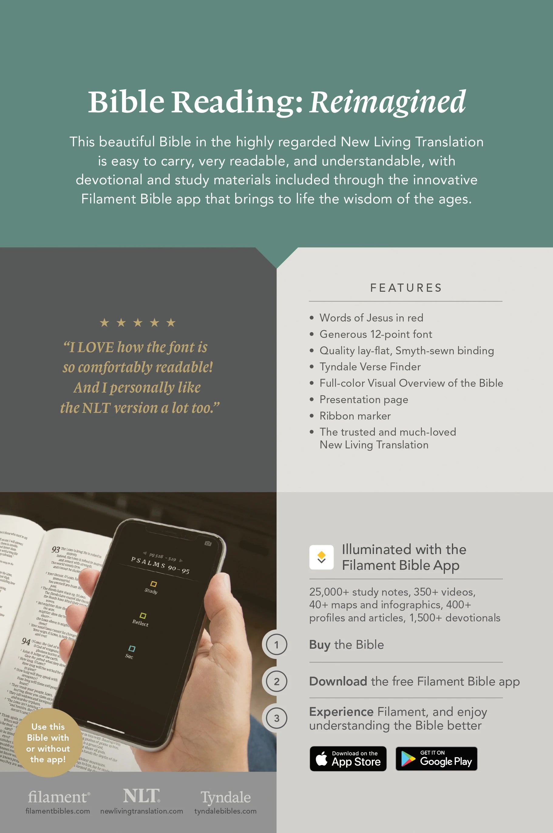 The new NLT Personal Size Giant Print Bible, Filament-Enabled Edition has comfortably readable text and an attractive layout in an easy-to-carry size. And while it has the same low price of basic text Bibles, the NLT Personal Size Giant Print now offers much more. It not only features a bold new design and the trusted and much-loved New Living Translation (NLT) but also includes the groundbreaking Filament Bible app.