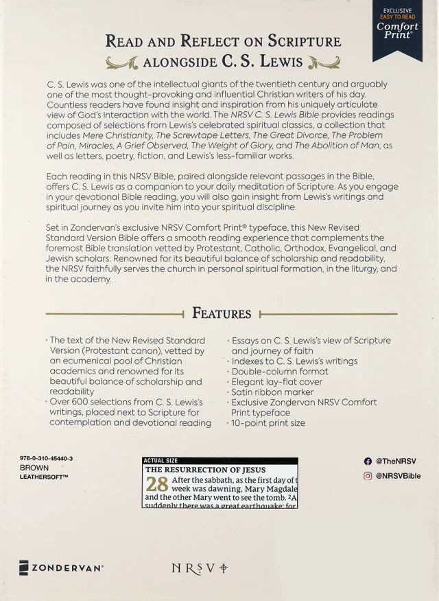 Each reading in this NRSV Bible, paired alongside relevant passages in the Bible, offers C. S. Lewis as a companion to your daily meditation of Scripture. As you engage in your devotional Bible reading, you will also gain insight from Lewis's writings and spiritual journey as you invite him into your spiritual discipline.