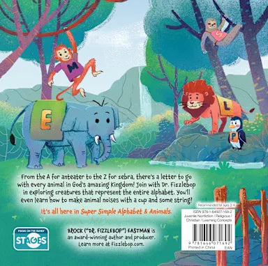 Bedtime read alouds and family devotions Homeschool lessons Christian school classrooms Church nursery story times Super Simple Alphabet and Animals with Dr. Fizzlebop combines learning all the letters of the alphabet with corresponding animal names. Each page includes fun zoology facts that help teach the ABCs, build vocabulary, and encourage curiosity. Bright, cheerful pictures capture kids' attention while simple, God-centered explanations help children see God's loving hand in every part of His creation.
