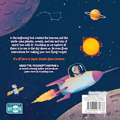 Bedtime read alouds and family devotions Homeschool lessons Christian school classrooms Church nursery story times Super Simple Space Science with Dr. Fizzlebop introduces little learners to the basics of outer space! They will learn about the sun, moon, stars, and the planets in our solar system. Each astronomy concept is explained in an engaging way that builds vocabulary and encourages curiosity. Bright, cheerful pictures capture kids' attention while simple, God-centered explanations help children see God's loving hand in every part of His creation.