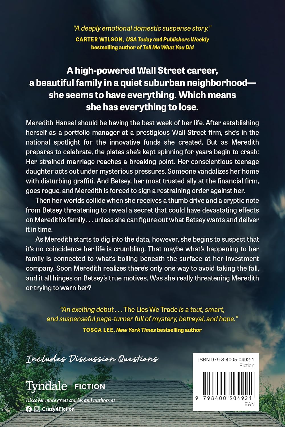 Great for fans of Colleen Coble, Laura Dave, Dani Pettrey, and Lisa Scottoline Clean, high-stakes women's domestic suspense with workplace secrets and family drama A stand-alone Wall Street thriller Includes discussion questions for book clubs