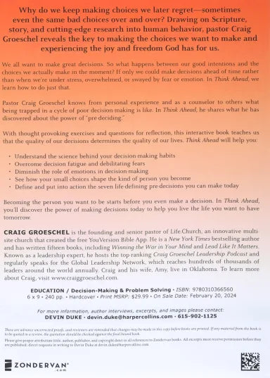 Pastor Craig Groeschel knows from personal experience and as a counselor to others what it's like to feel stuck. Think Ahead will help you define and put into action the seven life-defining pre-decisions you can make today that will help you live the life you want to have tomorrow.