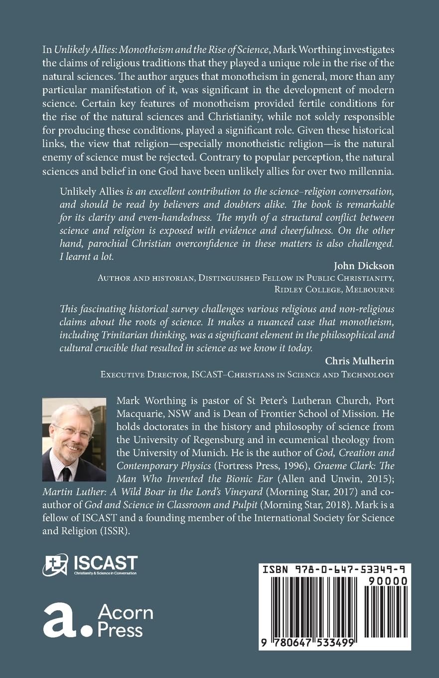 In Unlikely Allies: Monotheism and the Rise of Science, Mark Worthing investigates the claims of religious traditions that they played a unique role in the rise of the natural sciences. The author argues that monotheism in general, more than any particular manifestation of it, was significant in the development of modern science. Certain key features of monotheism provided fertile conditions for the rise of the natural sciences and Christianity, while not solely responsible for producing these conditions, played a significant role. Given these historical links, the view that religion—especially monotheistic religion—is the natural enemy of science must be rejected. Contrary to popular perception, the natural sciences and belief in one God have been unlikely allies for over two millennia.