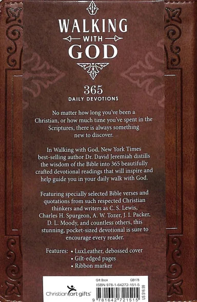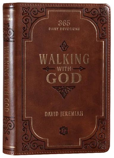 In Walking With God, New York Times bestseller author David Jeremiah distills the wisdom of the Bible into 365 beautifully crafted devotional readings that will help guide your walk of faith every day of the coming year. The Walking With God Devotional features select Bible verses and quotations from well-loved authors that include C. S. Lewis, Charles Spurgeon, A. W. Tozer, J.I. Packer, D. L. Moody to name but a few. The chocolate brown faux leather cover of the Walking With God Pocket Size Devotional is banded in a cross filigree design that wraps from the front cover to the back. David Jeremiah writes the Introduction to the devotional. Each day's reading starts with a Scripture verse, followed by a short devotional and finished off with a quote from an author. This well written devotional is sure to strengthen your daily walk with God. It will also make an encouraging gift for friends family and those just starting their walk of faith. 365-Day Devotional Chocolate Brown Faux Leather Cover Flexcover Heat Debossed and Gold Foiled Title 388 Pages Gild-edged Pages Full-Color Interior Ribbon Marker Size: 188 x 127 x 32mm -Publisher.
